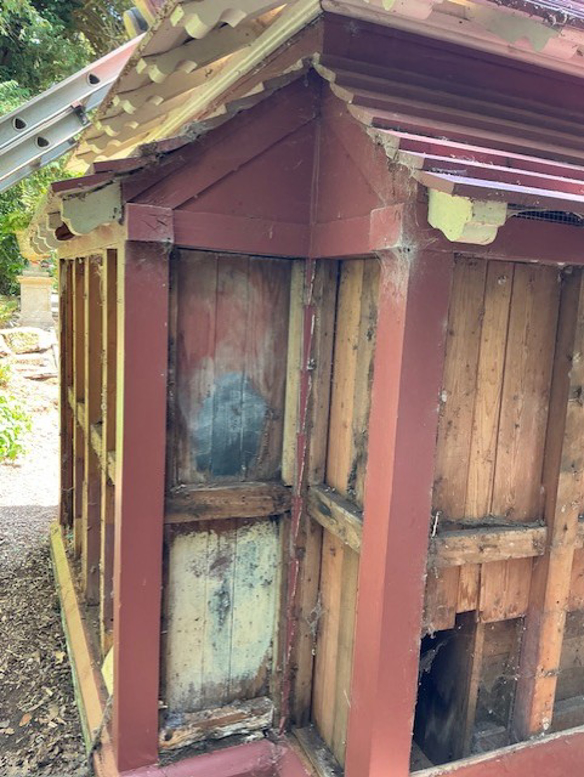 Around 10 years ago the roof of this wonderful structure was replaced, and other parts were repaired. Unfortunately, two fundamental problems occurred from this work: the lack of capping in the hip corners caused water to run through to the structure below, and with no damp proof being installed between the timber and brickwork of the main brink plinth, water penetrated the sole plate. As a result, extensive rot and water damage meant that the structure was at risk of sudden collapse and so the Summerhouse was taken to be repaired back in June 2025.