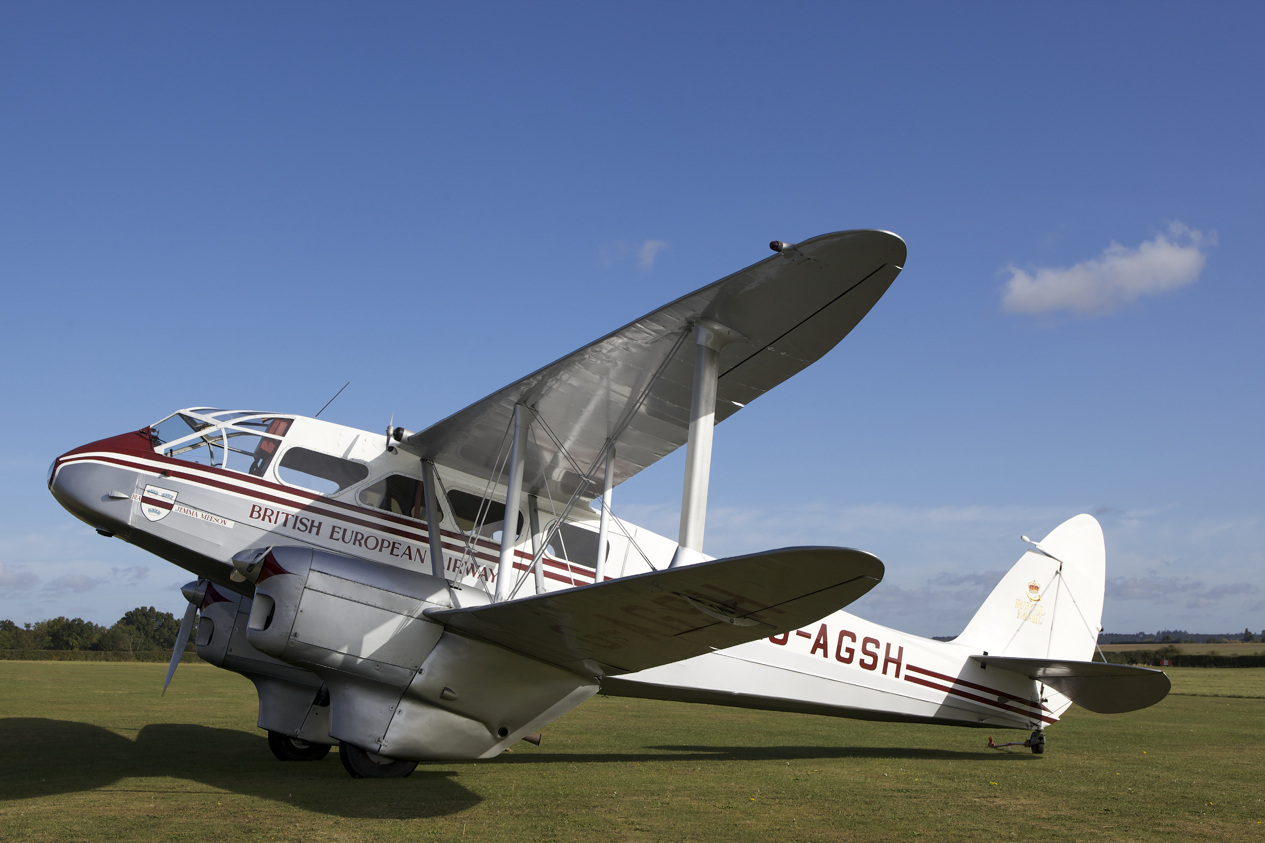 Built in 1945 as a Dominie by Brush Coachworks Ltd at Loughborough, G-AGSH was civilianised as a DH.89a and first registered to Channel Islands Airways Ltd of Jersey in July 1945. She then went to the Minister of Civil Aviation from November 1946 to January 1947 before spending nine years with BEA as James Keir Hardie, operating the Highlands and Islands service. (‘GSH was later bought back by BEA in the early 1960s and as their last biplane, named Lord Baden Powell, operated the Lands End - Scilly Isles route until the introduction of helicopters.) During her life she has passed through the hands of many owners, including more than half a dozen small airlines, a short spell in Ireland as EI-AJO, and the RAF Sport Parachute Association at Abingdon.